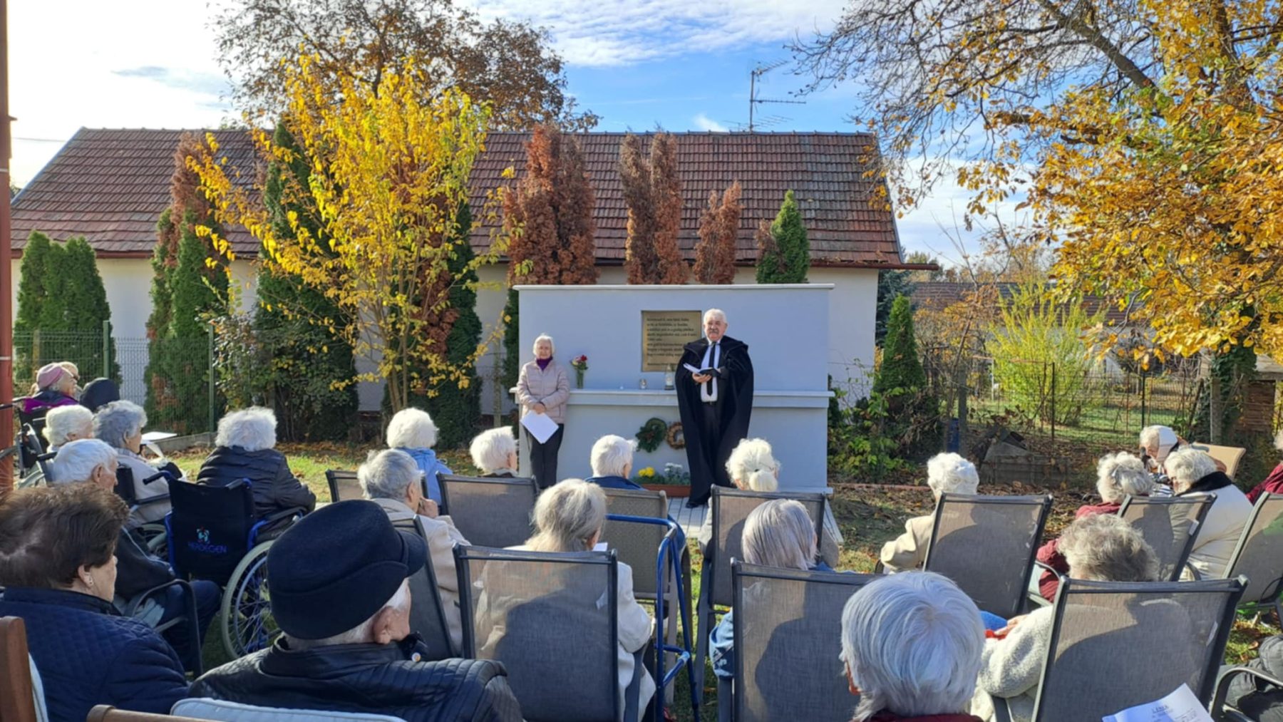 „Bárány György Református presbiter a Szandaszöllősi református gyülekezet képviseletében Mindenszentek alkalmából megemlèkezést tartott az intézményünk Vízpart krt-i telephelyén. „